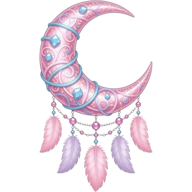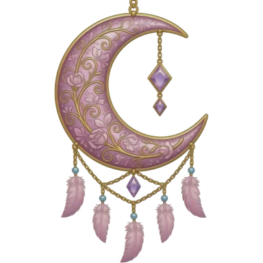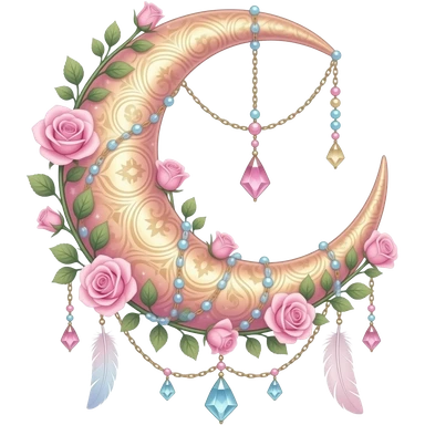 Rosy shiny glossy sparkly romantic pastel crescent damask moon with rose quartz pastel vines pastel gems pastel beads with feathers and chains emoji