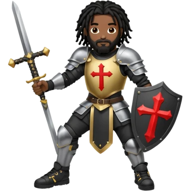 African American with long black dreadlocks with black beard wearing a black knight amour wearing wearing black Air Force 1 low top shoes holding a shield with cross on it and a double edge sword emoji