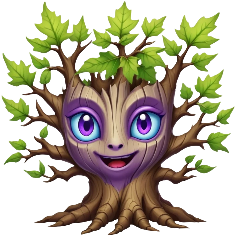 An ancient, psychic tree evolves by absorbing the essence of fallen autumn spirits, sprouting a radiant leaf, channels both forest wisdom and fiery seasonal magic through its gnarled. Purple eyes, blue eyes sharp teeth, bark wood skin, heterochromatic eyes, maple leafs, poly styleemoji