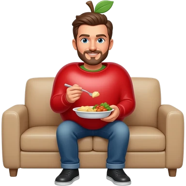 Man sitting on sofa with meal on his hands with an apple style person emoji