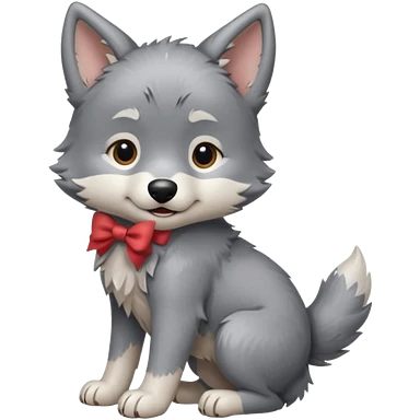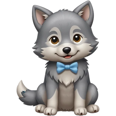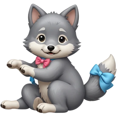 an animated gif-style sticker emote of a wolf puppy in a play-bow wagging its tail in a smooth, natural arc over its back. It has a pink bow on one ear and bright blue eyes emoji | AI Emoji Generator