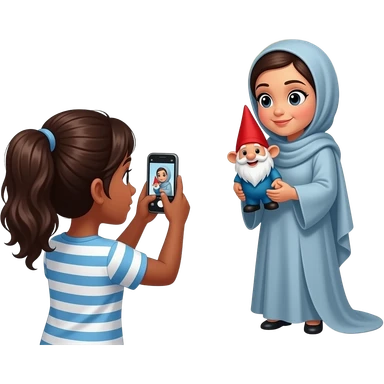 A black girl taking a photo of an Arab girl holding a small gnome while standing in front of the Hollywood sign emoji