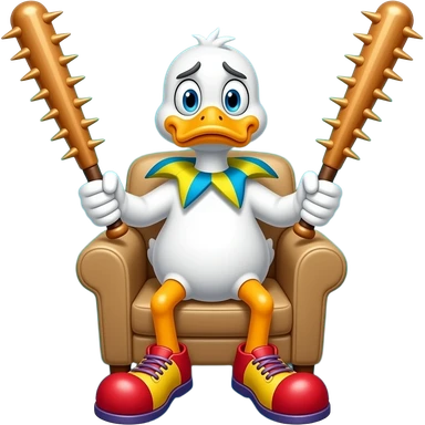 tensely worried surprised and frustrated teal circle holding spiked baseball bats and an armchair sitting on a duck wearing clown shoes emoji