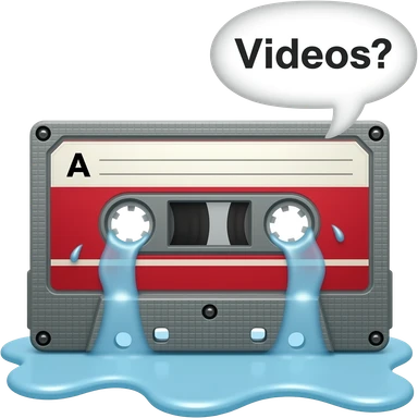A 3d vintage audio cassette morphed into a sort of square face with a confused expression. A word bubble reads: "Videos?" emoji