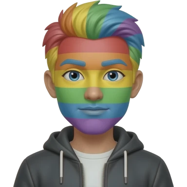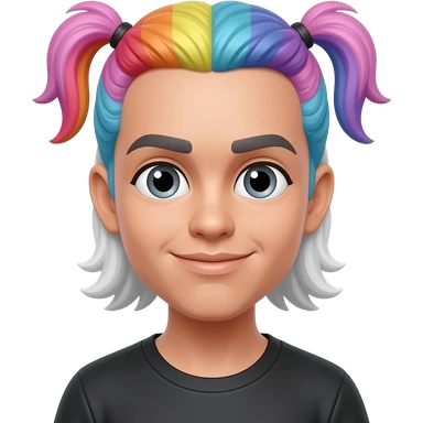 Overweight nonbinary person with rainbow pixie cut wearing pride pins emoji