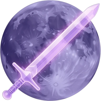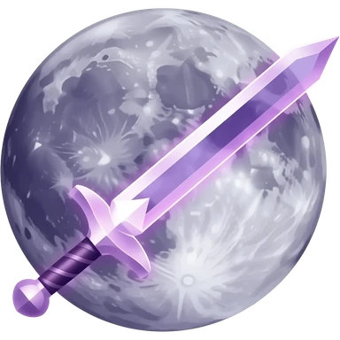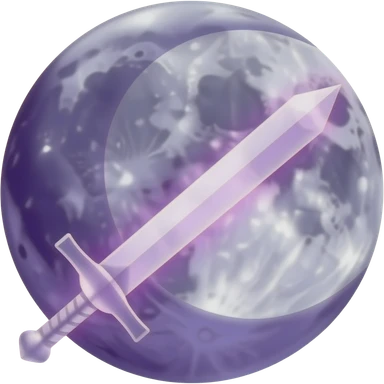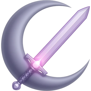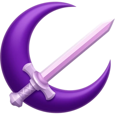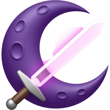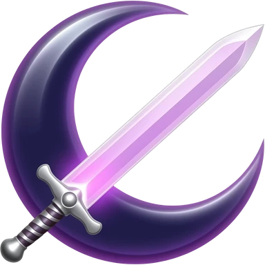 transparent dark purple detailed crescent moon with an elegant detailed glowing transparent sword, emoji style. The sword is positioned so that the blade points away from the moon and the hilt faces toward the moon (blade facing outward, not toward the moon). Soft violet and pink glow emoji