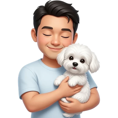 An emoji of an Asian man with a gentle smile, peacefully closing his eyes while cradling a small white Maltese in both arms; both the man and the puppy have their eyes shut, with their heads slightly tilted toward each other in a serene embrace. emoji