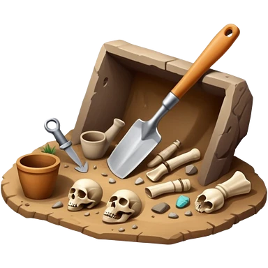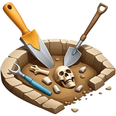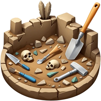 An icon featuring an excavation site with a trowel and ancient artifacts, like pottery and bones, scattered around. The design includes a partially uncovered fossil and a digging brush, symbolizing the discovery of history through archaeology. Transparent background emoji