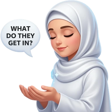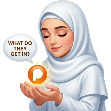 An ethereal Muslim woman, prayed position, closed eyes, wearing a soft white satin hijab, tasbih, prayer rug, gently cupping a luminous Patreon icon (the round 'P' icon) made of liquid light. Text bubble from mind: 'WHAT DO THEY GET IN?'. Isolated on white, magical stardust, 3D icon style emoji | AI Emoji Generator
