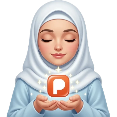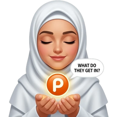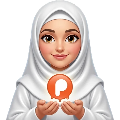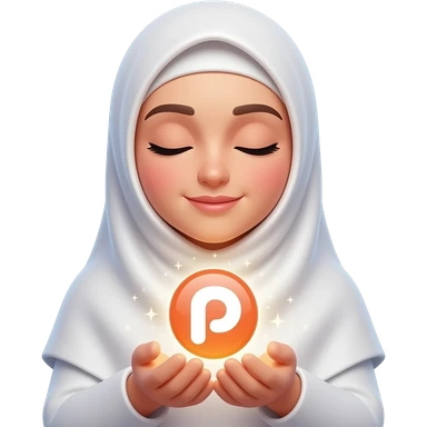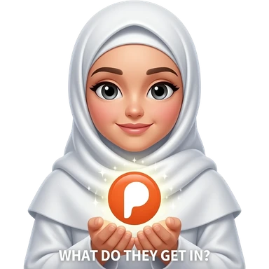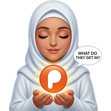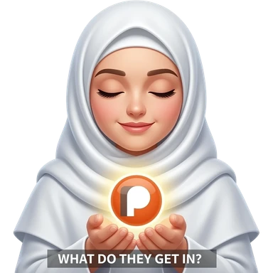An ethereal Muslim woman, prayer position, closed eyes, wearing a soft white satin hijab, gently cupping a luminous Patreon icon made of liquid light. Text bubble: 'WHAT DO THEY GET IN?'. Isolated on white, magical stardust, 3D icon style emoji | AI Emoji Generator