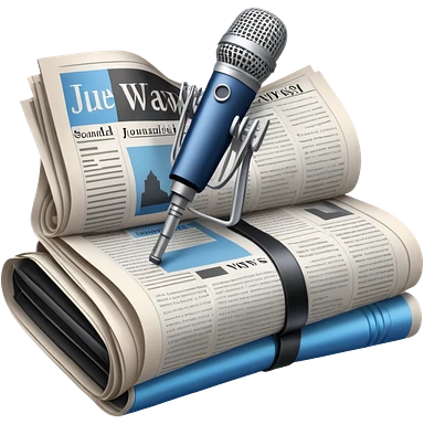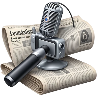 An icon featuring a microphone, a newspaper, a professional camera, representing journalism and mass media. The design includes headlines and imagery, symbolizing the spread of news and information. Transparent background highlights the power of communication and media.emoji
