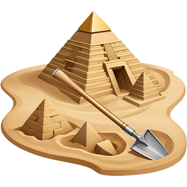 An icon showing archaeological tools like a trowel, brush, and pickaxe placed on sandy ground, with an Egyptian pyramid in the background. The design symbolizes excavation and discovery of ancient history, blending tools and iconic landmarks. Transparent background.emoji