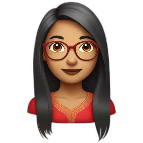 An Indian girl with a round face and straight long hair and old school transparent glasses. Wearing a red dress emoji | AI Emoji Generator