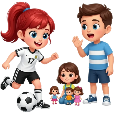 Due vignette orizzontali, nella prima una ragazza che gioca a calcio e che indossa dei pantaloni corti neri , dei capelli rossi in una coda che gioca a calcio e una ragazzo gli urla (vignetta vuota) nella seconda un ragazzo che gioca con le bambole e sua sorella gli dice (vignetta vuota) emoji