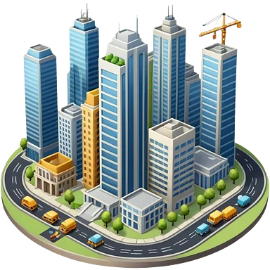 An icon showing a city-building game interface, inspired by Sim City. The design features a bustling city with roads, skyscrapers, and parks, with buildings being constructed and managed. The game’s interface, with stats and controls, is visible at the top. Transparent background. emoji