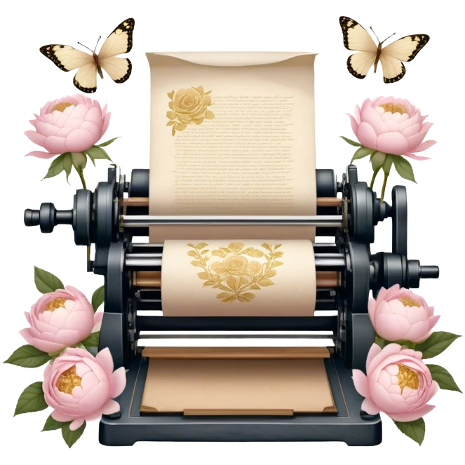 An old-fashioned letterpress printing studio, where stacks of aged parchment are printed with delicate golden floral motifs of soft pink roses and white peonies, as pearl butterflies rest gently on the warm paper. emoji | AI Emoji Generator