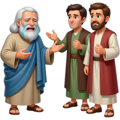 An old man wearing draped clothing from biblical times, crying and arguing with 3 men emoji