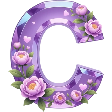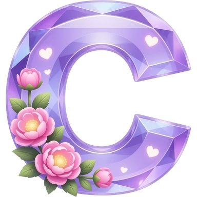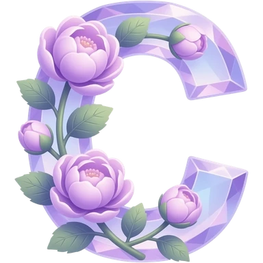 An uppercase letter 'C' sculpted from translucent crystal that glows with a soft violet light. Miniature glowing peonies and tiny heart-shaped leaves grow along its edges. Iridescent texture, fairycore aesthetic, macro photography style emoji