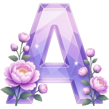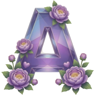 An uppercase letter 'A' sculpted from translucent crystal that glows with a soft violet light. Miniature glowing peonies and tiny heart-shaped leaves grow along its edges. Iridescent texture, fairycore aesthetic, macro photography style emoji