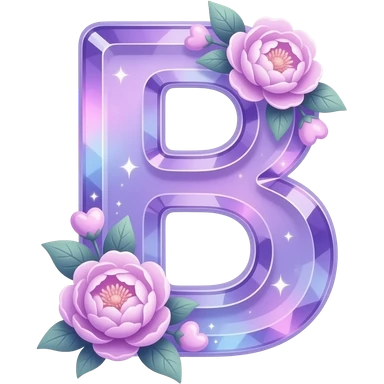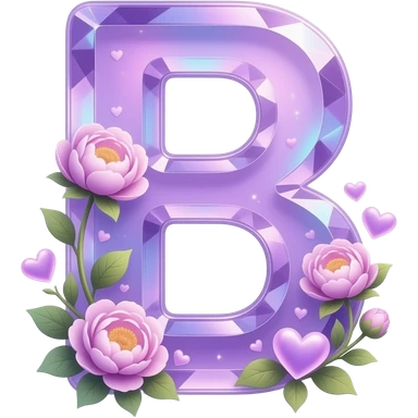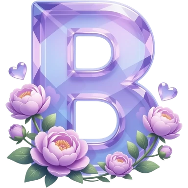 An uppercase letter 'B' sculpted from translucent crystal that glows with a soft violet light. Miniature glowing peonies and tiny heart-shaped leaves grow along its edges. Iridescent texture, fairycore aesthetic, macro photography style emoji