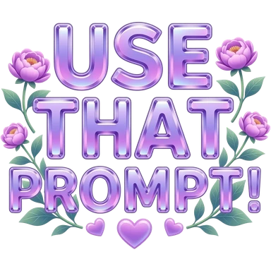 An uppercase text 'USE THAT PROMPT!' sculpted from translucent crystal that glows with a soft violet light. Miniature glowing peonies and tiny heart-shaped leaves grow along its edges. Iridescent texture, fairycore aesthetic, macro photography style emoji