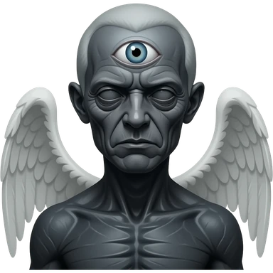ancient mythological being, humanoid but distorted, wise and eerie presence, dark mystical aura, symbolic eye, subtle wings, philosophical and surreal vibe, strange creature between human and angel, realistic but uncanny, minimal emoji style emoji