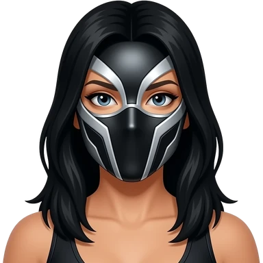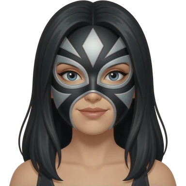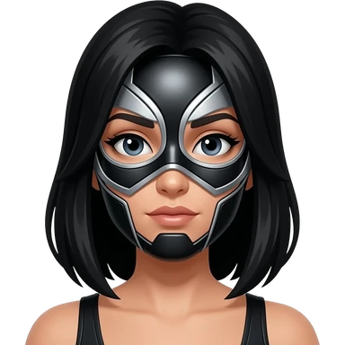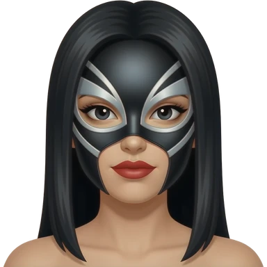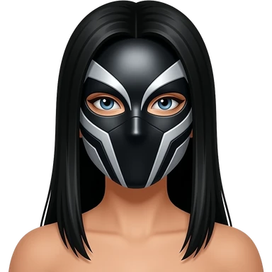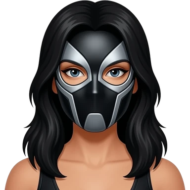 Mascara de luchador de mujer que se le vea el cabello negro largo, la mascara negro con plateado con diseño como si fuera un androide un Ciborg que sea simétrico que no se le vea el torso, solo el emoji con la cara y los detalles que te di emoji