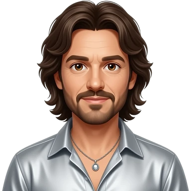 Barry Gibb from Bee Gees with brown eyes, long dark brown hair, white metallic dress shirt, silver necklace emoji