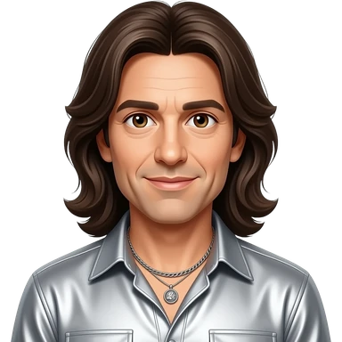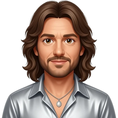 Barry Gibb from Bee Gees with brown eyes, long dark brown hair, silver metallic shirt, silver necklace emoji