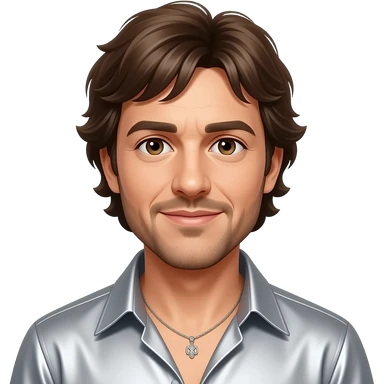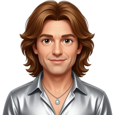 Maurice Gibb from Bee Gees with brown eyes, long brown hair, silver metallic shirt, silver necklace emoji