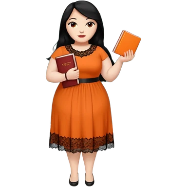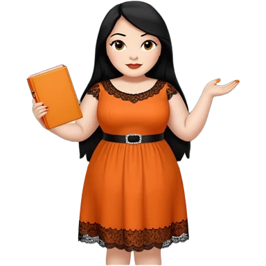 plus-size White woman is wearing makeup. She has long, straight, waist-length black hair and is wearing a full-body orange dress with rhinestones and lace. Her nails are painted orange. She is holding a book in one hand and a crayon in the other. A chalkboard is behind her. emoji