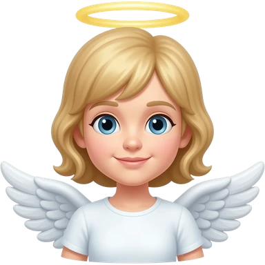 Blonde girl (from the chest up), green eyes, and light skin. Gazing forward. Long, straight hair. Thin lips. A light pink, long-sleeved, tight-fitting knit blouse buttoned in the front with small white buttons, some are undone. White wings protruding from her back, like an angel's. Doe eyes. emoji