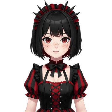 Gothic anime lady with short black hair, black and red Lolita dress, freckles, makeup emoji