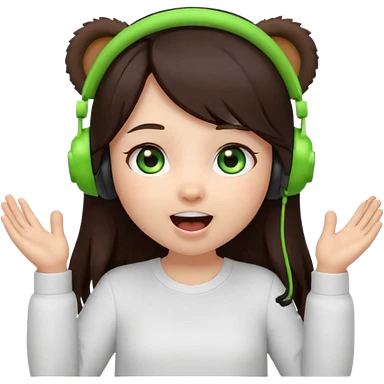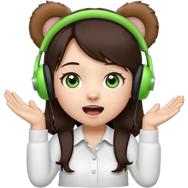 Animated emoji, Chibi girl, long dark brown hair, green eyes, wearing a white shirt and small brown bear ears on a black headset, with wide happy surprised eyes and mouth and clapping excitedly emoji