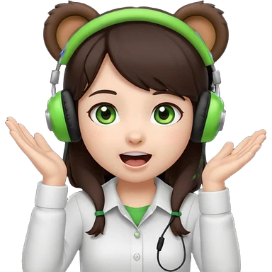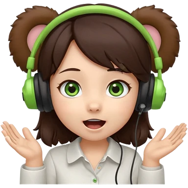 Animated emoji, Chibi girl, dark brown hair, green eyes, wearing a white shirt and small brown bear ears on a black headset, with wide happy surprised eyes and mouth and clapping excitedly emoji