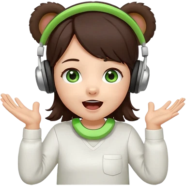 Chibi girl, dark brown hair, green eyes, wearing a white shirt and small brown bear ears on a headset, with wide happy surprised eyes and mouth and clapping excitedly emoji