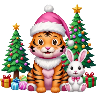 Smiling Pink tiger with Santa sitting by a bunny and brightly lit colorful Christmas trees and candy canes 🎁 emoji