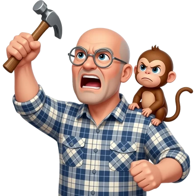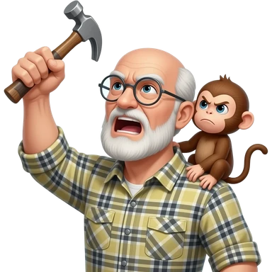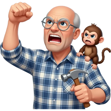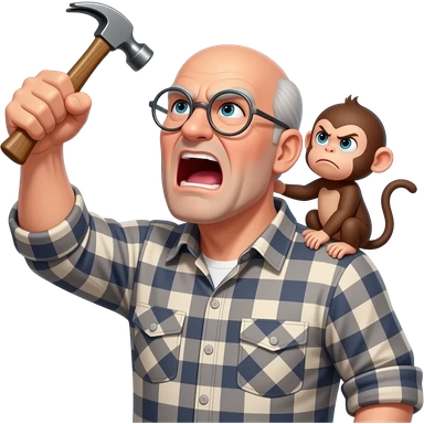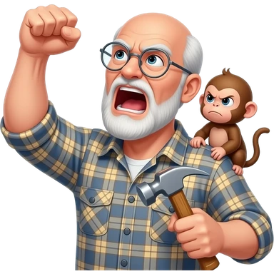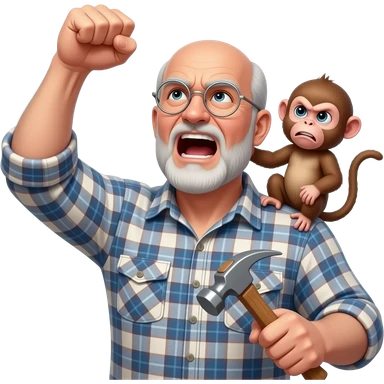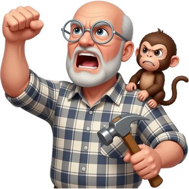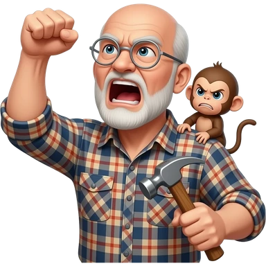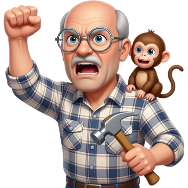 Angry old man with a plaid shirt with silver round glasses balding, NO facial hair yelling at the sky and shaking his fist at the sky holding a hammer in his LEFT hand and a angry baby monkey on his shoulder. emoji