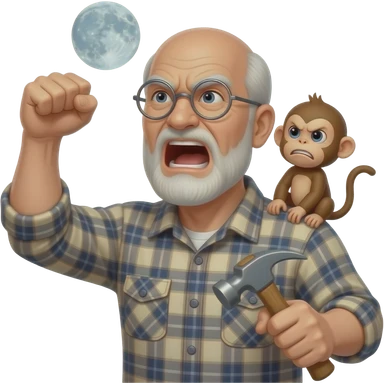 Angry old man with a plaid shirt with silver round glasses balding, no beard or mustache yelling at the moon and shaking his fist angrily at the sky holding a hammer in his LEFT hand and a angry baby monkey on his shoulder. emoji