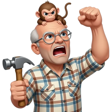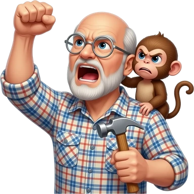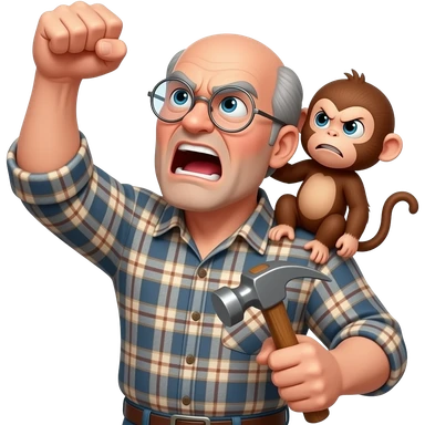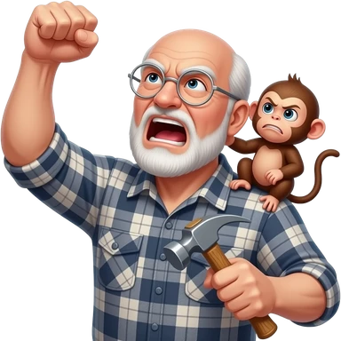 Angry old man with a plaid shirt with silver round glasses balding, no beard or mustache yelling at the sky and shaking his fist angrily at the sky holding a hammer in his LEFT hand and a angry baby monkey on his shoulder. emoji