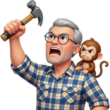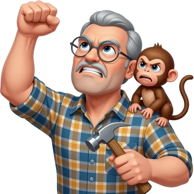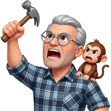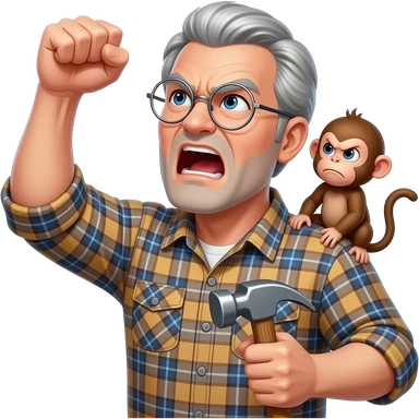 Angry old man with a plaid shirt with silver round glasses with grey hair, no beard or mustache yelling at the sky and shaking his fist angrily at the sky with a hammer in his left hand and a angry baby monkey on his shoulder. emoji