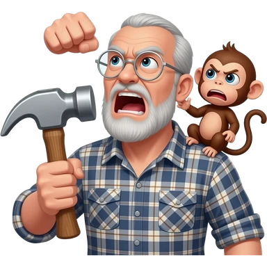 Angry old man wearing a plaid shirt with silver round glasses with with grey hair and no beard or mustache looking at the sky and shaking his fist at the sky with a hammer in his left hand with a angry baby monkey on his shoulder emoji