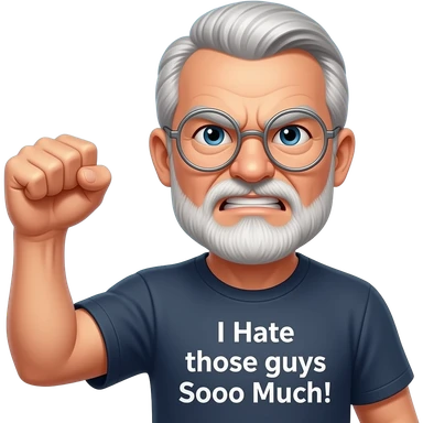 Angry old man with bushy eyebrows with silver round glasses shaking his clentched fist at the sky with an "I Hate those guys Soooo Much ! t-shirt emoji