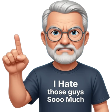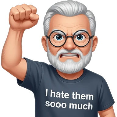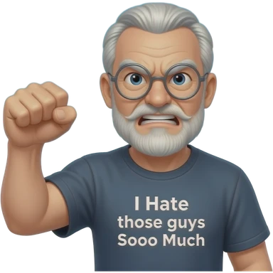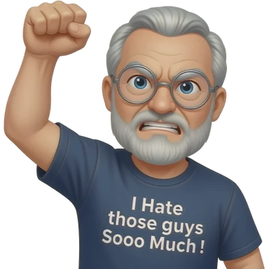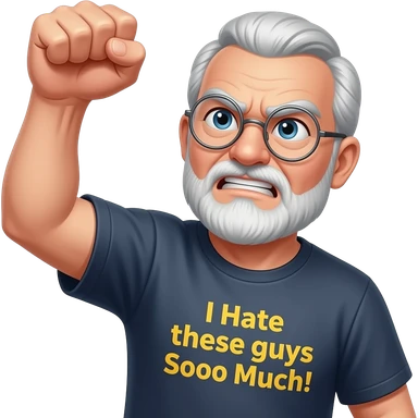 Angry old man with bushy eyebrows with silver round glasses shaking his clentched fist at the sky with an "I Hate those guys Soooo Much ! t-shirt emoji