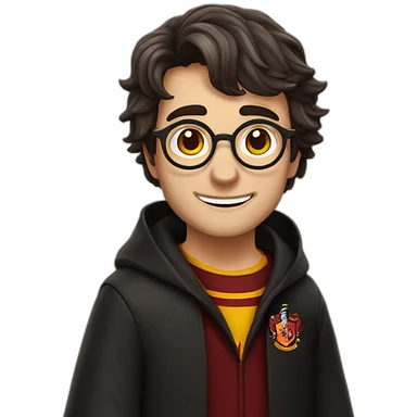 Create an emoji of a young wizard Harry Potter with round glasses, messy black hair, and a lightning-shaped scar on his forehead. He should have bright green eyes and be wearing a black robe with a red and gold Gryffindor scarf emoji