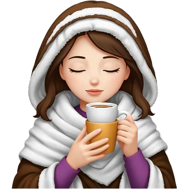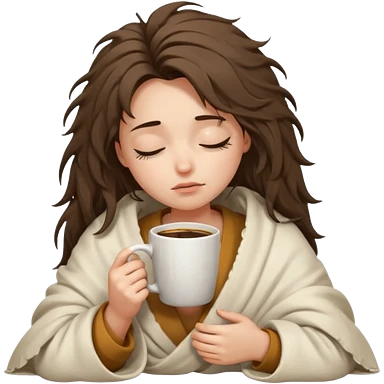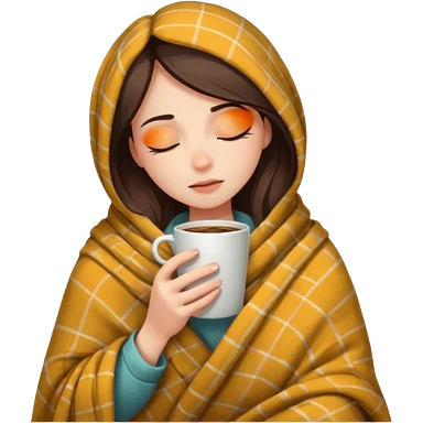 girl inside a offwhite blanket holding a coffee mug eyes closed, looking sad emoji