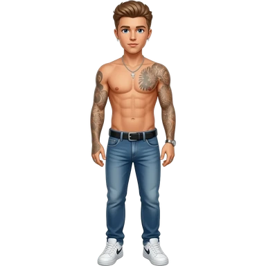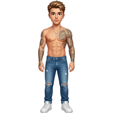 Justin Bieber with brown eyes, golden brown hair, dark purple metallic vest, shirtless with necklace and earrings emoji