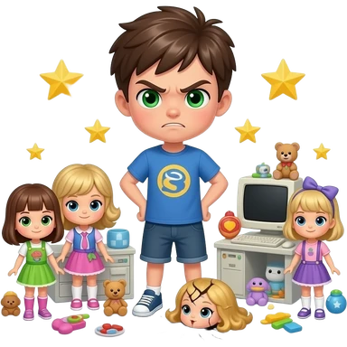 Angry Teenage boy Green eyes surrounded by toys and smala dolls, computers, stars, around and foot on one broken Doll with blond hair emoji