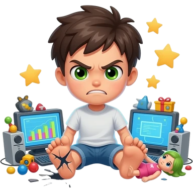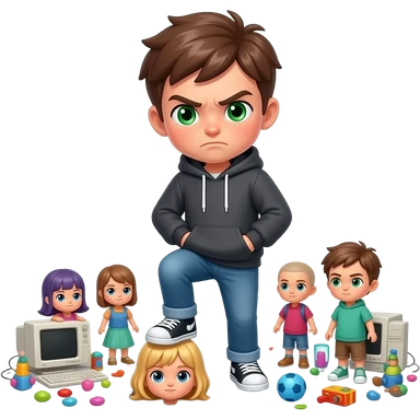 Angry Teenage boy Green eyes surrounded by toys, computers, stars, around and foot on broken Doll emoji
