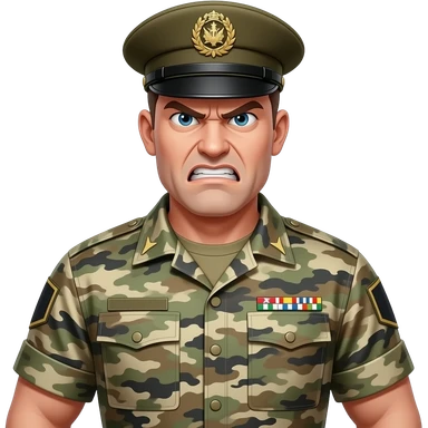 drill sergeant character wearing a classic sergeant hat and a camouflage army shirt. The character should have an angry intense expression. full torso emoji